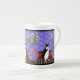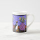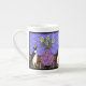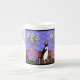 Cette fine tasse de porcelaine osseuse est agrémentée d'une peinture digitale d'origine fantasque de Leslie Sigal Javorek d'un mignon petit pingouin éveillé positivement par l'humongous vase avec des marguerites fraîches encore plus gigantesques poussant vers le ciel. Dans l'arrière - plan, un beau papier peint bleu violet & tapis rayé étroit dans les tons lilas, iris, rouille & noir.