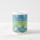 Une tasse de café chic de porcelaine tendre à personnaliser, avec des motifs de mix'ne match de Lis-de-le Valley sur un arrière - plan bleu ; "pour l'amour de la collection snob et Painterly de lis".