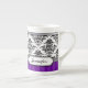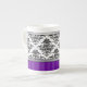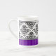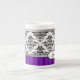 Le motif noir et blanc élégant de damassé a conçu par Liz Molnar sur la tasse de porcelaine tendre avec le ruban argenté, l'étiquette, le texte personnalisable et les rayures pâles sur l'arrière - plan variable de couleur.