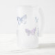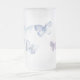 Une tasse en verre givré décorée d'une conception sensible de papillon dans les bleus mous et les pourpres.