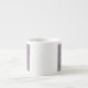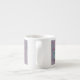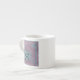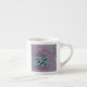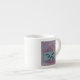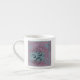 Coupe espresso blanche avec une image, des deux côtés, du mot "Om" en sanskrit écrit sur une enseigne en bois bleu bordée de défilement noir sur un arrière - plan pourpre poussiéreux avec des tulipes d'aqua, un staff de musique et un ruban d'aqua filé à travers trois anneaux gris.