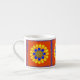 Fleur vibrante avec pétales en orange, orange rouge, bleu cobalt, bleu clair, vert et jaune.