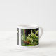 Sirotez votre expresso dans cette chic tasse avec une photo saisissante de fleurs de rhubarbe. Une épaisse tige verte de rhubarbe monte à travers le côté gauche du cadre. Deux branches avec des tiges de minuscules fleurs jaune-vert pâle inclinent en diagonale vers la droite tandis que deux tiges courtes de bourgeons attachées à la tige principale pointe vers la gauche du cadre pour un bon équilibre de composition. Une feuille de papeterie brune entoure les articulations des branches minces à la tige principale. Une autre feuille brun rougeâtre est suspendue au sommet du cadre le long de la tige. Un observateur attentif remarquera que les troncs d'arbre ombragés dans le tiers supérieur de l'arrière - plan sont tous inclinés de sorte que le plante de rhubarbe apparaisse verticalement. Les deux tiers inférieurs de l'arrière - plan contiennent principalement des fougères et des perwinkle, un ensemble de verdures à texture indistincte. Une faible profondeur de champ et la lumière du soleil mettent en évidence les tiges de rhubarbe fleuries au premier plan de la photo couleur. Photo numérique, couleur. Copyright © 2008 Claire E. Skinner. Tous droits réservés.