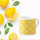 A sunny lemon yellow and white espresso cup with a geometric pattern.