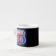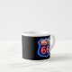 Cette tasse expresso blanche avec son image, de part et d'autre, d'un panneau de néon rouge, blanc et bleu Route 66 sur le noir, est une touche spéciale, un cadeau ou une faveur appropriée pour une fête des années 20, 40 et 60!