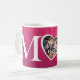 Ajoutez votre photo à cette tasse de photo de jour de mères de coutume ! L'arrière - plan rose vibrant avec le coeur léger forme à l'arrière-plan. Grande "MAMAN" typographique dans des tous les casquettes, où la lettre centrale est une forme de coeur.