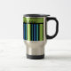 Une tasse chic et personnalisable de voyage ou de banlieusard, avec un motif chaise longue-rayé en vert au néon, turquoise, noir et bleu d'éblouissement. Une partie de la collection snob et Painterly "de lunes bleues".