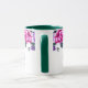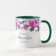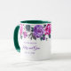 Cette tasse florale comporte des roses violettes et roses avec des feuilles vert émeraude de mer autour du bord supérieur de la tasse sur un fond blanc. Texte violet en attente de votre personnalisation. L'intérieur de l'exemple présenté est vert. Choisissez la couleur de l'intérieur qui vous convient. Personnalisez cette tasse ou achetez-la telle quelle.