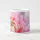 Image of a bright pink chrysanthemum with of yellow with a full moon and dragonflies