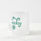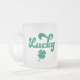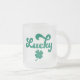 Partagez la chance avec les Irlandais avec notre tasse en verre dépoli de la Saint Patrick, d'inspiration vintage. Le design est "chanceux" dans la typographie de script de bulle rétro vert émeraude et une illustration de trèfle à quatre feuilles avec un effet vintage en détresse.