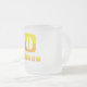 Oshun a gelé mug de verre avec nom et iconic O et de la conception de cowries, tous deux imprimés en jaune et orange.