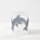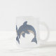 Cette tasse de café ou de thé a trois dauphins qui sautent, bleu foncé et blanc avec un look de parties scintillant dépoli et les yeux tourbillonnants.