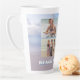 Tall latte mug with beach scene background. Customize with four photo templates and text along the bottom.  A calm, blue sea and smooth beach sand is the background for sharing some fun photos of the kids, vacation, pets, and family time.