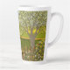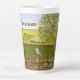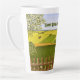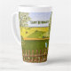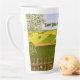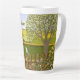 A latte mug with a beautiful image of a nature scene: A bird sitting on a weathered fence, wildflowers growing around the fence, a farmer on a tractor, working his land, trees with leaves, and farmland with various colors. Original artwork by W.B.