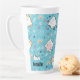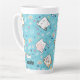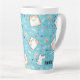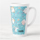 Tasse en latte avec un mignon motif de chat, posée sur un arrière - plan bleu et décorée avec des arcs-en-ciel et des empreintes de pattes et plus encore.