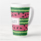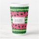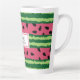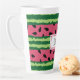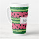 Une tasse en latte avec un mignon motif de pastèque. Croûte verte en couches de rayures avec une couche de rayures roses avec des graines noires à l'intérieur. Amusement et design estival. Un rectangle superposé avec votre texte à l'intérieur.