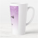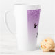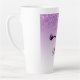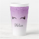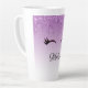 Tasse en latte personnalisée avec un design élégant et tendance. L'arrière - plan est un dégradé violet avec une image de fausse parties scintillant scintillante qui descend du haut. Une paire de cils mignons ceinturés sous l'image de la parties scintillant.