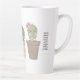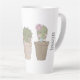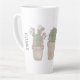 Tasse en latte au design fantaisiste. 3 cactus mignons tous dans une rangée avec des visages souriants assis dans un pot à fleurs chacun portant des bijoux.