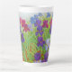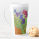 Une idée cadeau artistique pour les amateurs d'art floral, cette grande tasse en latte de haute qualité présente le design coloré des fleurs violettes d'Iris d'une peinture à l'huile de l'artiste fine et commerciale Carolyn McFann de Two Purring Cats Studio.