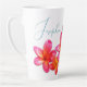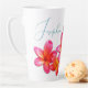 Grande tasse en latte avec fleurs de plumeria rose et design étoiles de mer. Personnalisez avec un nom en utilisant une police de caractères bleu et moderne. Les fleurs tropicales et deux étoiles de mer enveloppent la tasse. Le nom sera sur le devant pour un buveur droitier. Cette grande tasse à café est blanche avec des fleurs rose et orange réalistes et la vie marine brune et blanche.