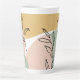 Élégante tasse en latte tendance aux formes abstraites biologiques et feuilles botaniques en dessin en silhouette. Le design a une palette de couleurs ocre jaune, vert et pêche rousse.