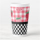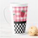 Tasse à thème du printemps / été en lunettes avec moitié supérieure de fraises rouges et roses sur en vichy rose et moitié inférieure de damier noir et blanc.