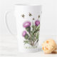 Herbes et abeilles latte mug. Les bourdons bourdonnent sur la burdock à floraison violette, le fil blanc et les calendules jaunes dans cet enveloppement autour du design qui couvre une grande tasse blanche. Ajoutez du texte en bas en lettres majuscules vertes ou laissez-le vide.