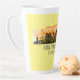 La tasse en latte élégante présente la plage de Huntington, la silhouette de la ville de CA avec les coordonnées de latitude et de longitude et un lavage à l'eau orange du coucher du soleil sur l'arrière - plan jaune.