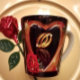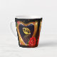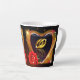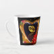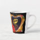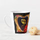 Magnifique tasse à latte avec une image imprimée d'une peinture acrylique de deux alliances à l'intérieur d'un cœur en forme dorée avec une rose rouge.