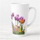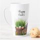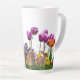 Cette tasse de latte de vacances de Pâques présente un design adorable de lapin et de jardin de tulipes. Il y a également un panier de Pâques avec des œufs colorés.