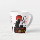 Coupe de café avec "Black Cat and Black Coffee" à base d'affiches classiques de Théophile Steinlen. Ce design présente son chat noir assis sur un mur en brique recouvert de lierre avec une grande tasse de café. Vapeur et coeurs sortant de la tasse de café et une pleine lune rouge vif dans l'arrière - plan.