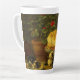 Latte Mug mettant en vedette la peinture à l’huile Kittens at Play de Henriëtte Ronner-Knip (1821-1909). Une chatte mère regarde ses quatre chatons jouer sur une chaise, un plante et un bol de nourriture. Un cadeau parfait pour les amoureux de les chats et les amateurs de romantisme.