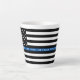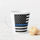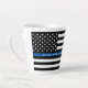 Montrez votre soutien avec cette mince tasse en latte de drapeau américain de ligne bleue. Ce design est doté d'un drapeau noir et blanc avec une fine ligne bleue avec un nom et un lieu de travail que vous pouvez personnaliser. Le cadeau idéal pour les familles et les amis qui sont des policiers et dans l'application de la loi. Conçu par un artiste de renommée mondiale ©Tim Coffey.