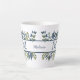 Elle va adorer cette jolie tasse expresso personnalisée avec un motif de feuilles bleu et vert indigo et des images de fougères faisant une bordure pour votre monogramme au centre. Le monogramme et les images sont placés sur un arrière - plan blanc. Votre monogramme est répété sur les deux côtés de la tasse, avec votre prénom ou autre texte au centre entre les monogrammes.