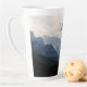 Tasse en latte avec une photo de belles montagnes, ciel nuageux, et collines ondulées remplies d'arbres au premier plan. Couleur bleu gris.