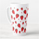 Une tasse en latte avec un motif à fraise avec le fruit de différentes tailles en rouge et blanc.