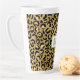 Une tasse en latte avec un motif élégant. Des taches de léopard noir exotique sur un arrière - plan d'or. Style sauvage mais élégant. Un cadre rectangle de couleur blanche avec une fausse feuille d'or borde le dessus avec votre texte personnalisé à l'intérieur.
