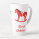 Cette magnifique tasse en latte de Noël présente une image art numérique d'un mignon cheval à bascule de style scandinave. Le cheval est rouge avec une crinière rouge foncé, la queue et les sabots. Le cheval sympathique sourit. Il a une selle blanche et des rois avec de jolis motifs de style Scandi rouge sur la selle, y compris le soleil, la lune et les étoiles, les coeurs et les fleurs. La base du cheval rocking est rouge et est couverte de feuilles blancs. Le design a été inspiré par le cheval suédois Dala. Il y a du texte personnalisé pour que vous puissiez personnaliser ce design avec votre propre message.