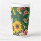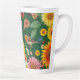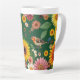 Cette grande tasse en latte a un arrière - plan vert foncé avec des fleurs et des oiseaux.