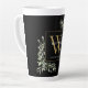 Mug latté à monogramme de feuilles de verdure à l'aquarelle élégante avec une initiale de monogramme doré sur un fond noir chic. Conçu par Thisisnotme©