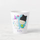 Tasse en latte personnalisée avec une image fantaisiste d'une licorne et d'un oiseau. Cette paire est heureuse de sourire pendant qu'elle traîne ensemble. Un petit coeur flotte au-dessus de leur tête. La licorne est blanche avec des ailes d'anges et une corne rose. L'oiseau est d'une couleur bleu verdâtre portant une toque noire avec un chat kitty noir avec des oreilles. Un nuage bleu placé derrière ces heureux meilleurs amis.