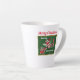 Cette tasse Latte a Santa Claus à bord d'un train rouge et blanc avec des roues à bonbons de menthe poivrée transportent des lettres et des sucres de canne sur un arrière - plan vert avec le texte : Choo, Choo Voici Comes Père Noël avec une bordure en or. Customisez le texte Joyeux Noël en haut avec le modèle.