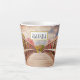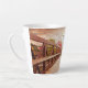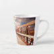 Une tasse en latte avec une photo pittoresque. Un pont en bois qui mène à un chemin entouré d'arbres forestiers qui changent de couleur.