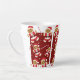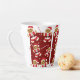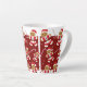 Une tasse en latte avec un motif d'hommes en pain d'épices souriants à Père Noël s'habillent sur un arrière - plan rouge et blanc foncé. Ajoutez cette tasse amusante, festive et festive à votre panier, afin que vous puissiez en profiter dans votre propre maison.