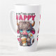 A funny, sarcastic, and colorful design showcases an adorable highland cow with big blue eyes, brown fur, and a sad expression, holding a steaming cup of coffee and a daisy. The vibrant text reads, "You can't make everyone happy, you are not coffee." This charming design is available on a variety of products, making it a perfect gift for coffee lovers.