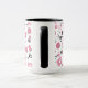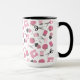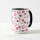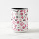 Une tasse comportant une conception orientée de couture se composant d'une machine à coudre, des bobines de fil, d'un coussin de goupille, des ciseaux, des échantillons de tissu, et des aiguilles de couture. La conception a un modèle de couleurs rose.