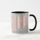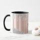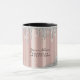 Ce modèle de tasse de luxe présente une fausse feuille métallique rose gold et rose blush sous des paillettes qui coulent. Détails noirs personnalisables et image de fond personnalisée.