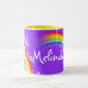 Arc-en-ciel lumineux et coloré "que vos" enfants nommés attaquent. Cadeau parfait pour un enfant vibrant. La tasse indique : Melinda ou personnalisent cette tasse avec le nom de votre choix jusqu'à 7 lettres. Tasse conçue exclusivement par Sarah Trett.