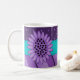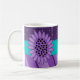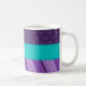Tasse de café moderne avec une fleur pourpre, ruban d'oeillet de turquoise sur un point de polka pourpre et arrière - plan de bande. Customisez-la en ajoutant le texte si vous souhaitez.