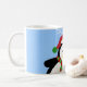 La tasse mignonne de pingouin de Noël comporte un pingouin avec un casquette du père noël en rouge, blanc et vert avec une écharpe rayée rouge et verte autour du cou et des flocons de neige sur un arrière - plan bleu-clair.